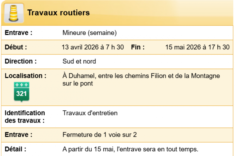Fermeture d'une voie - Route 321 - Travaux d'entretien - Duhamel