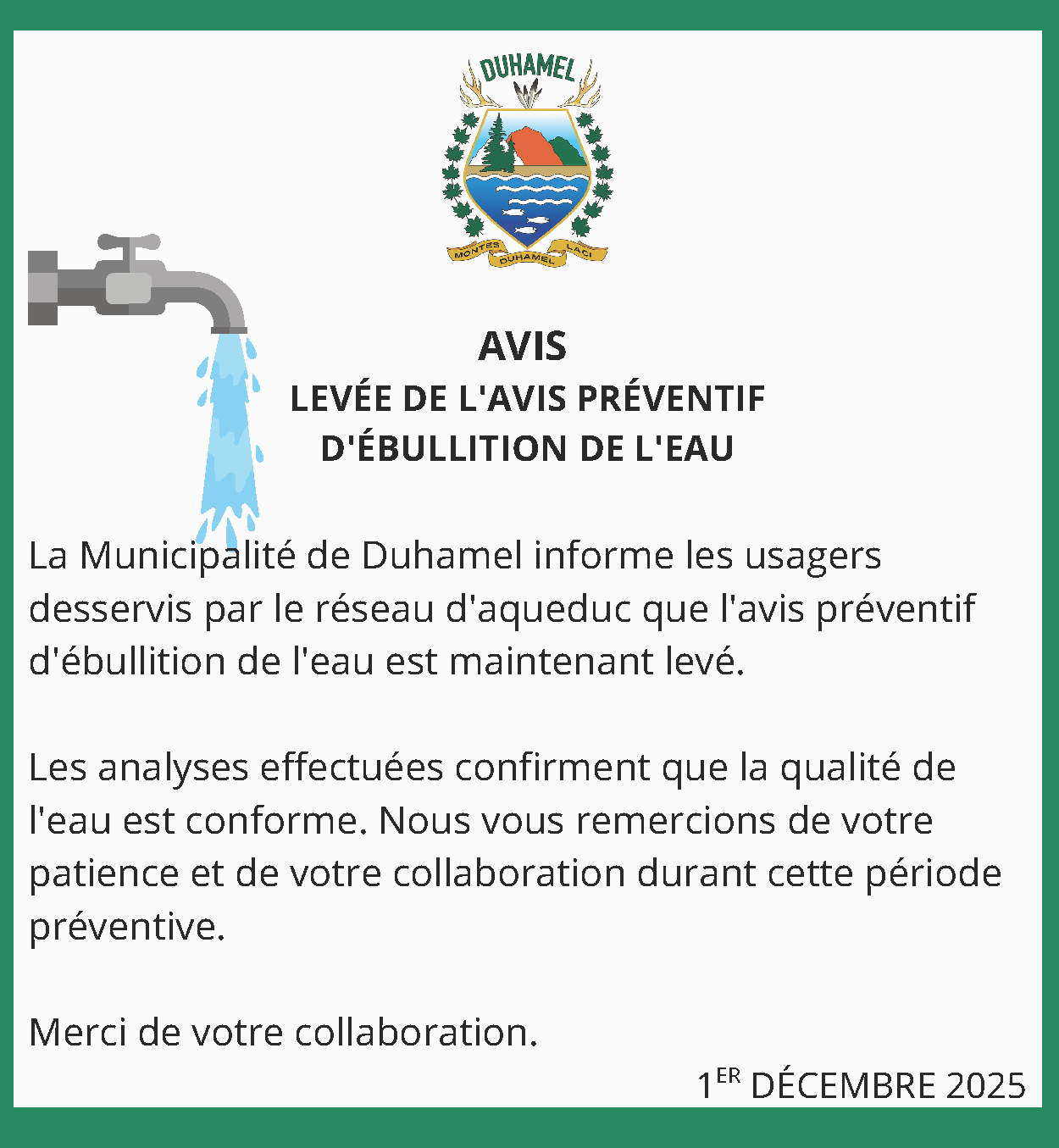 Avis - LEVÉE DE L'AVIS PRÉVENTIF D'ÉBULLITION DE L'EAU