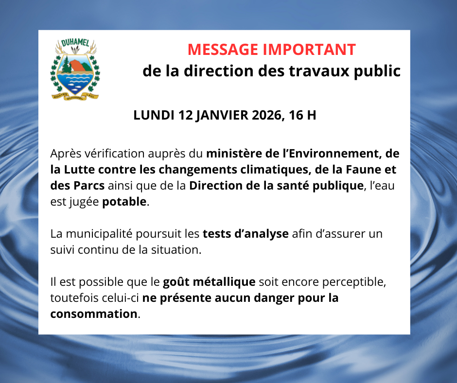 L'EAU EST MAINTENANT POTABLE