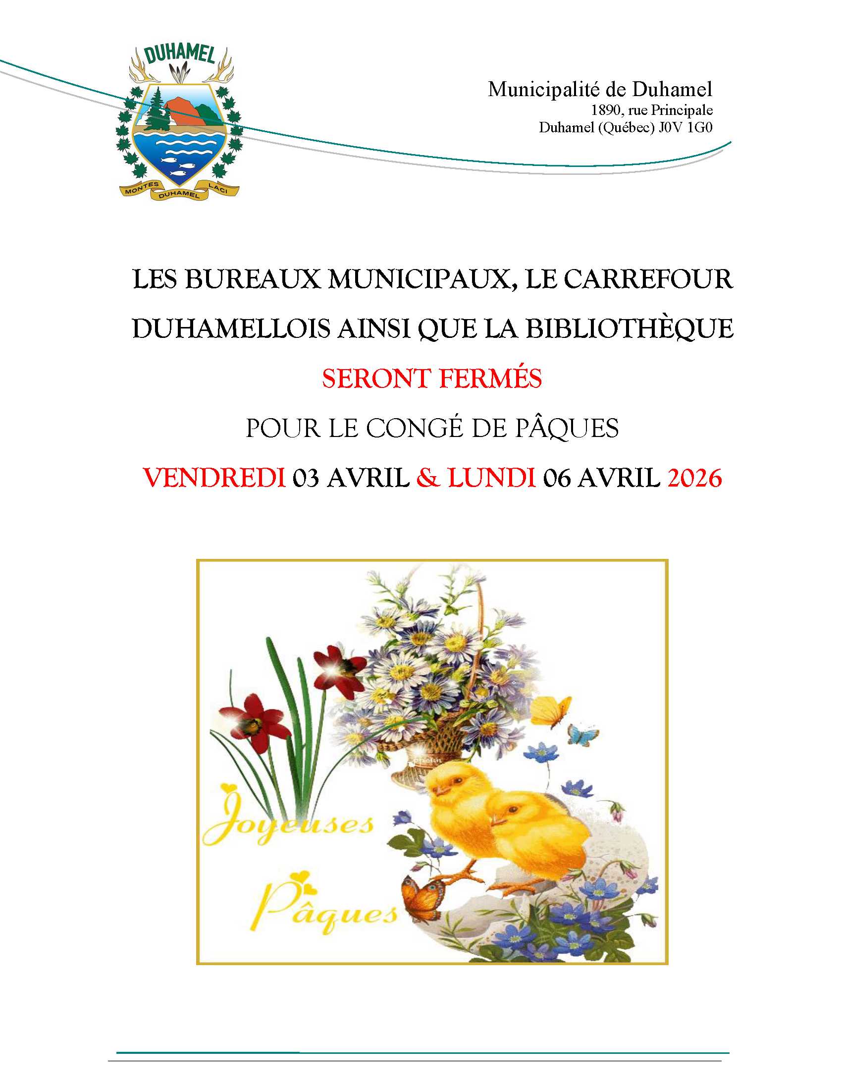 FERMETURE DES BUREAUX POUR LE CONGÉ DE PÂQUES