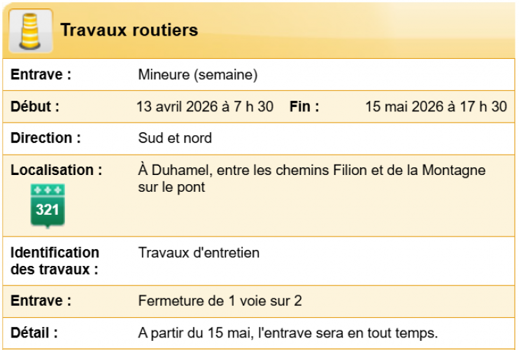 Fermeture d'une voie - Route 321 - Travaux d'entretien - Duhamel